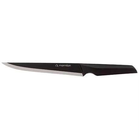 Le couteau à découper noir passion Marmiton est le couteau idéal pour trancher la viande en petit ou gros morceau. Idéal pour la viande rouge ou pour de la volaille, le couteau à découper aussi appelé couteau tranchelard permet de préparer finement les filets crus ou cuits. Avec sa lame de 20 cm extra fine, le couteau est parfait pour de belles tranches régulières. Conçu avec une émouture creuse, le couteau à découper de la gamme passion Marmiton peut conserver tout au long de sa vie une épaisseur très fine de 2 à 3 millimètres. La lame est revêtue d’une épaisseur antiadhérente pour faciliter le nettoyage du couteau à découper passion. Accompagné d’un manche en acier 430 noir, le couteau à lame noir offre un design moderne et élégant.