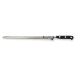Avec sa lame de 30 cm, le couteau saumon alvéolé Mathon Les Spécialistes est idéal pour une coupe ultra-fine des jambons, saumons crus ou fumés. Il fait partie d’une ligne de couteaux de cuisine de type professionnel pour un usage quotidien. Réalisés dans les meilleurs aciers, ils sont forgés d’une seule pièce avec une lame pleine soie monobloc, d’où leur exceptionnelle robustesse. En acier en haute teneur en carbone et chrome molybdène vanadium, ce sont de véritables outils de précision, efficaces et précis, qui s’adaptent à tous les besoins. Munis de manches ergonomiques POM satin galbé très robustes, ils sont garantis 25 ans.
