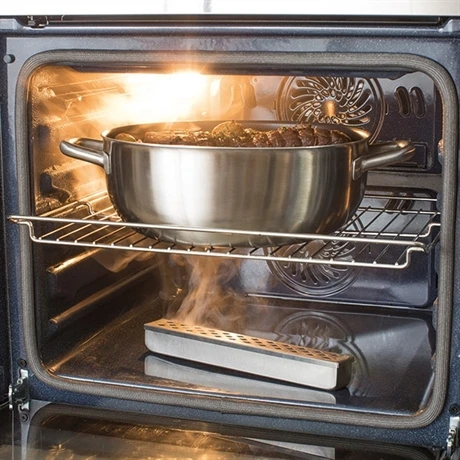 Disposez de l’eau dans le compartiment en inox, refermez à l’aide du couvercle perforé puis placez l’humidificateur dans le four. Grâce au couvercle perforé, la vapeur d’eau circulera lors de la cuisson tout autour du plat.