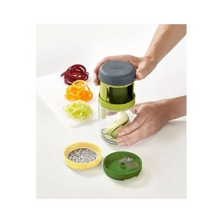 Le coupe légumes spirale 3 en 1 Spiro est compact et astucieux. Il est doté de deux lames, une pour moyenne et une fine, et une rape. Ainsi, vous pourrez réaliser des coupes épaisses ou fines de vos fruits et légumes en fonction de votre préparation, mais vous pourrez aussi râper votre fromage facilement. le couvercle possède des picots pour attraper efficacement les aliments et deux bras qui récupère les morceaux sur le coté pour ne rien perdre. La poignée soft touch est ergonomique pour une utilisation agréable. Le récipient récupère vos aliments découpés pour laisser votre plan de travail propre. Après usage, vous pourrez ranger les lames dans le socle.