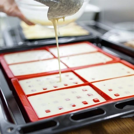 Faciles d’utilisation, les 2 moules à gaufres silicone permettent de préparer 8 gaufres dans le four. Finis les débordements de la pâte dans le gaufrier électrique et la corvée de nettoyage ! Une fois posés sur la plaque , les moules à gaufres se remplissent facilement et proprement avant d’être enfournés. Après la cuisson, les gaufres se démoulent en un tour de main. Il ne reste plus qu’à faire dorer l’autre face sur la plaque du four. En silicone antiadhérente, les 2 moules à gaufres garantissent une cuisson parfaitement homogène, sur toute la surface. Ils s’utilisent de -60°C à +260°C, au four, au micro-ondes et se nettoient au lave-vaisselle.