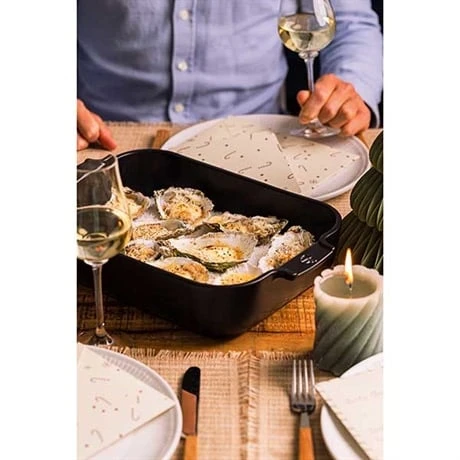 Ce plat rectangulaire de 36 cm a des angles arrondis, des rebords hauts et des poignées maniables pour être aussi pratique à utiliser qu’esthétique à présenter à vos convives. Dans son joli coloris noir satiné, ce plat à la surface lisse en émail vitrifié reste brillant durablement. Résistant aux rayures et aux chocs, ce plat robuste résiste à des températures allant de -20 à +250°C et s’utilise au four, au congélateur, au micro-ondes et au lave-vaisselle pour vous simplifier le quotidien.