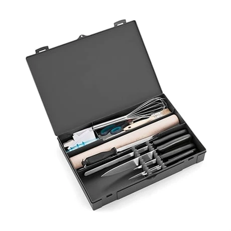 Le coffret rigide est modulable grâce à des peignes en polypropylène. Il possède 3 compartiments pour un rangement en vrac des ustensiles non fragiles (rouleau, spatules, douilles…) et un compartiment réglable en fonction de la longueur des lames, pour préserver les couteaux des chocs et les mains des blessures et les immobiliser. La sacoche et le coffret sont lavables et peuvent être tous les deux cadenassés.